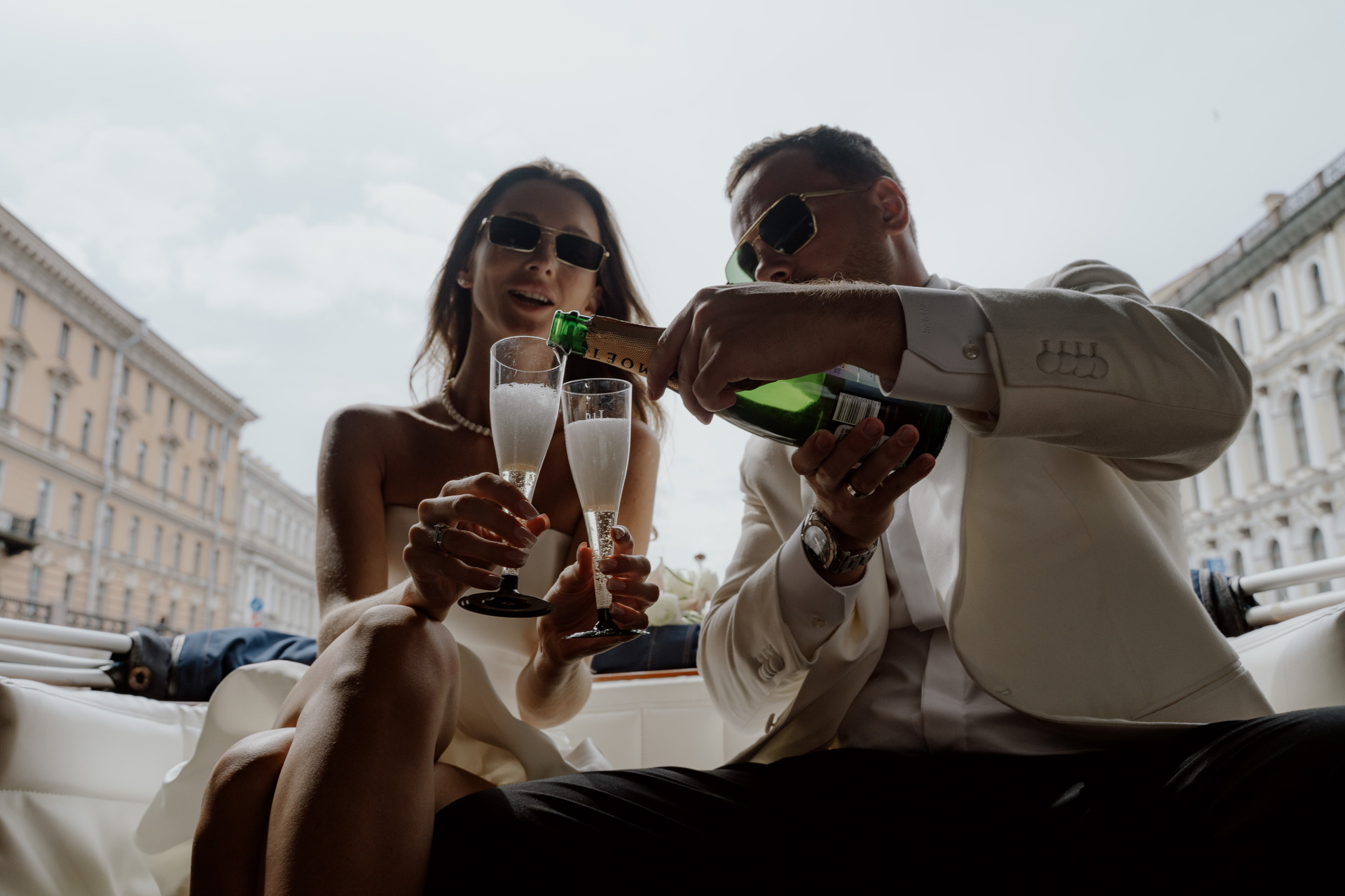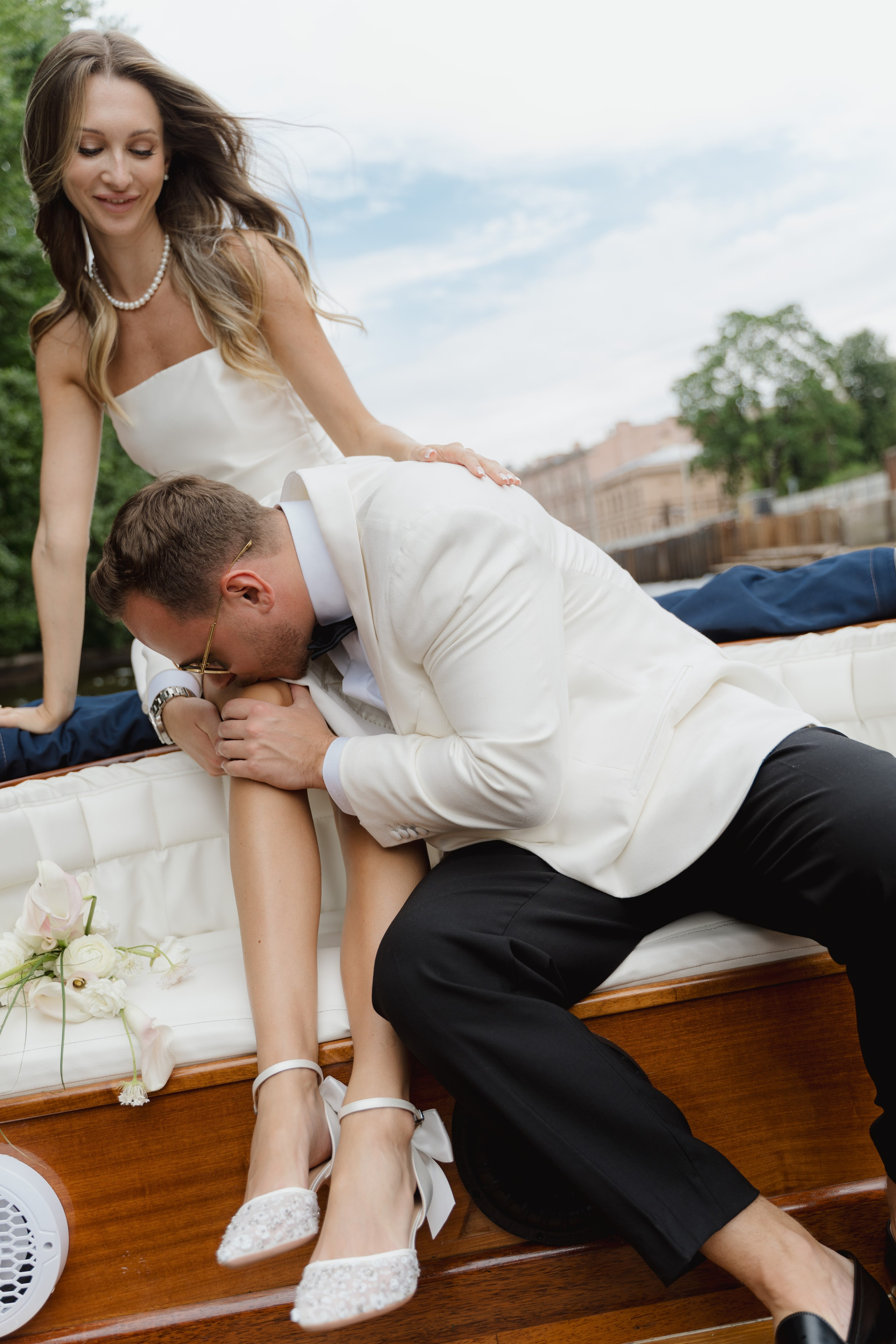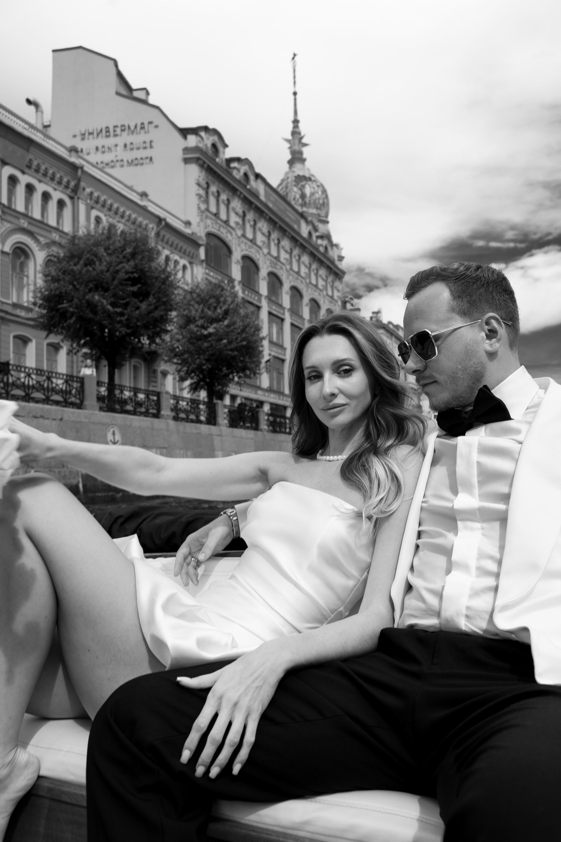 Первый день прошёл в близком кругу: как это обычно бывает — ЗАГС, прогулка, ресторан. Нам очень повезло с погодой: мы гуляли, катались на лодочке по рекам и каналам Северной Венеции, пили шампанское и много смеялись.